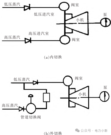 内切换:高低压汽源在汽轮机内部喷嘴室切换,通常由一套调节阀控制总进汽量,切换更平稳。