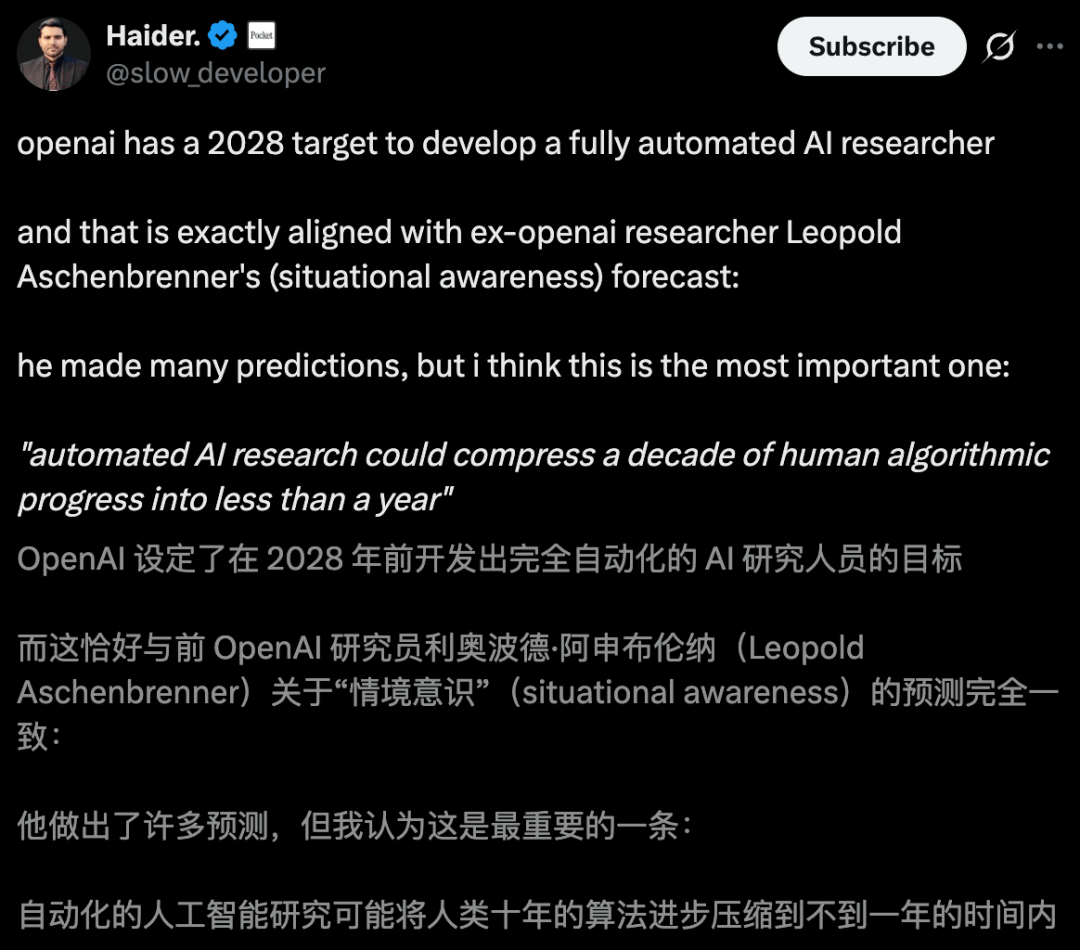 可以看到,OpenAI正酝酿一场关于「科研范式」的革命:目标是在2028年打造出具备全学科攻坚能力的「AI研究员」——
